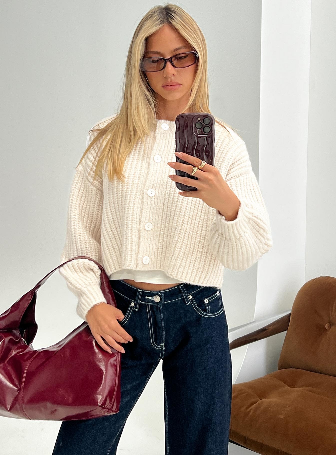 Crew neckline. button-up closure. drop shoulders. balloon sleeves. cropped