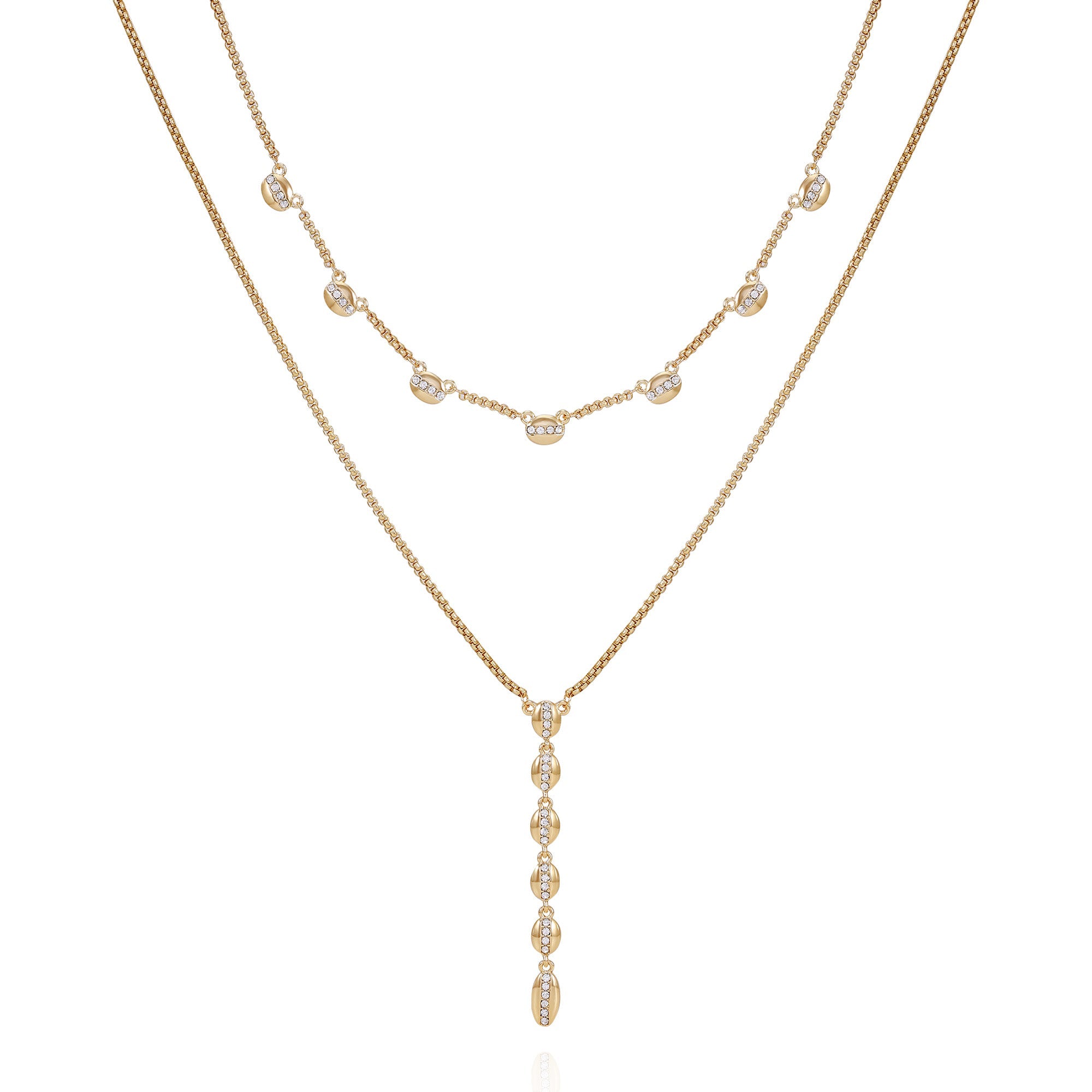 Featuring multiple layers of delicate goldtone chains adorned with shimmering crystal stones. This elegant design adds depth and sparkle. making the necklace a sophisticated choice for enhancing both everyday and formal outfits.