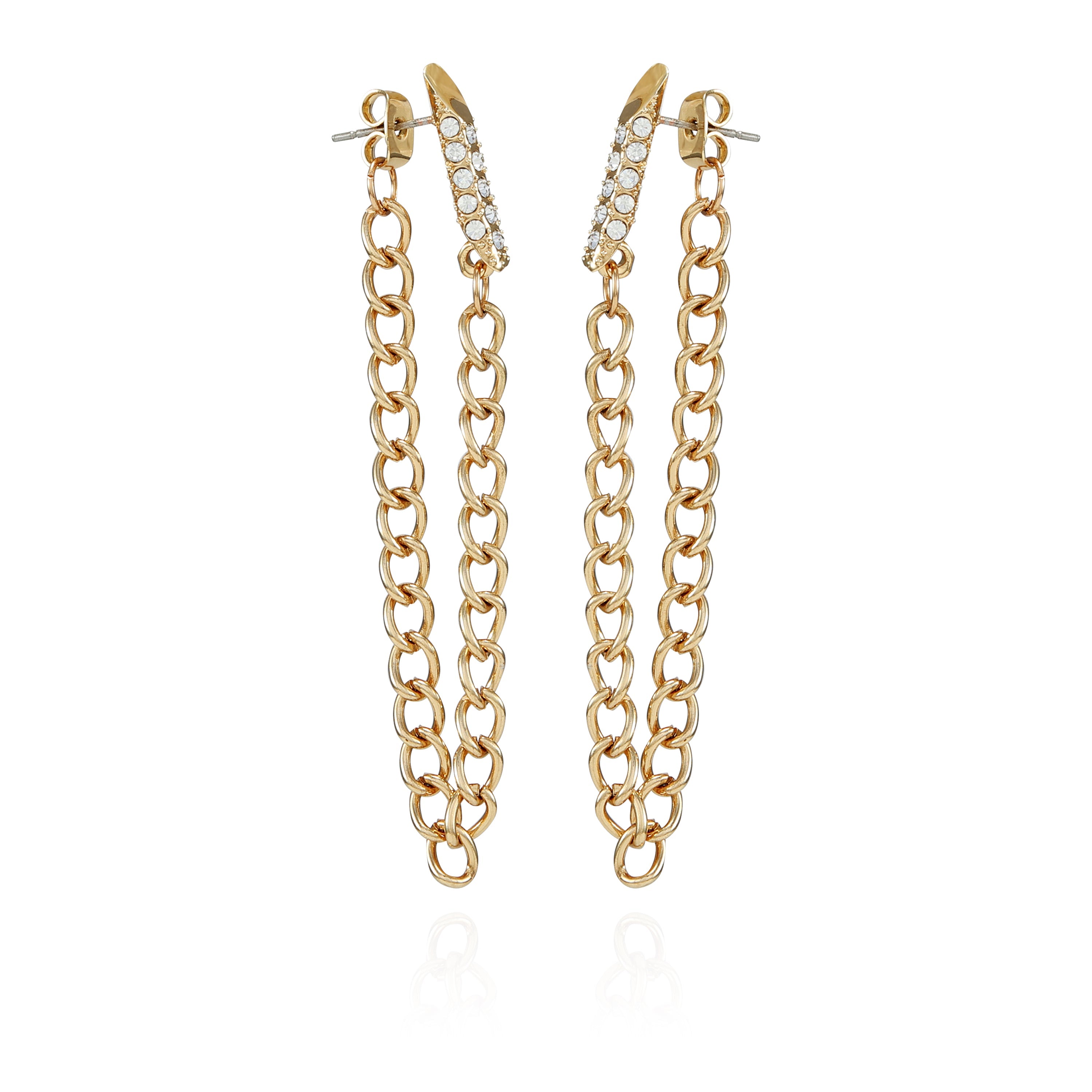 These stunning earrings feature sparkling crystal stones set along a luxurious goldtone chain. creating a dazzling and eye-catching effect. The statement drop style adds dynamic movement and dramatic flair. making these earrings perfect for making a striking impression at any event.
