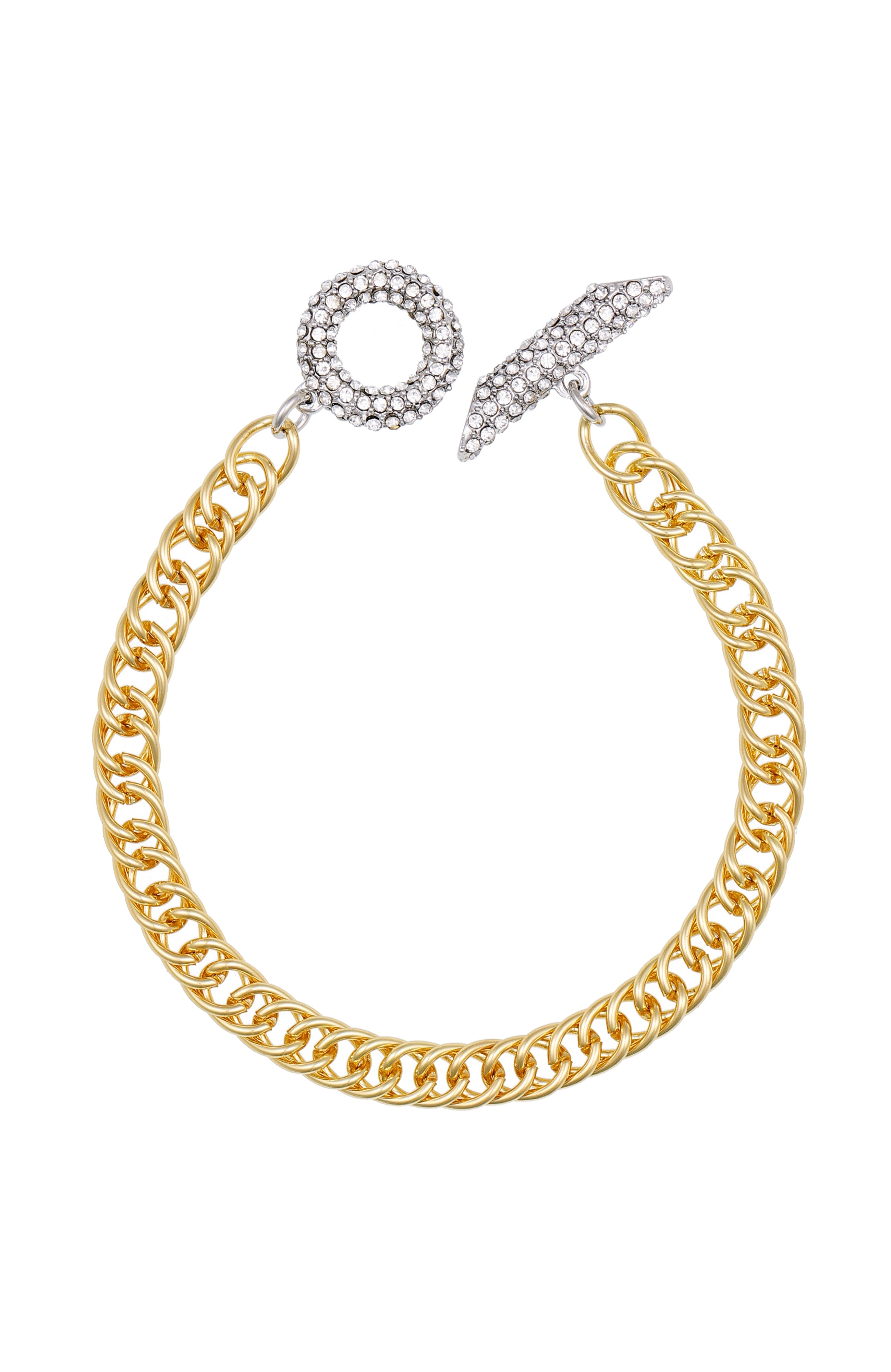 This Vince Camuto chain bracelet blends modern gold-tone links with a sparkling crystal toggle clasp. A bold yet refined piece that adds instant polish to any jewelry collection.