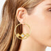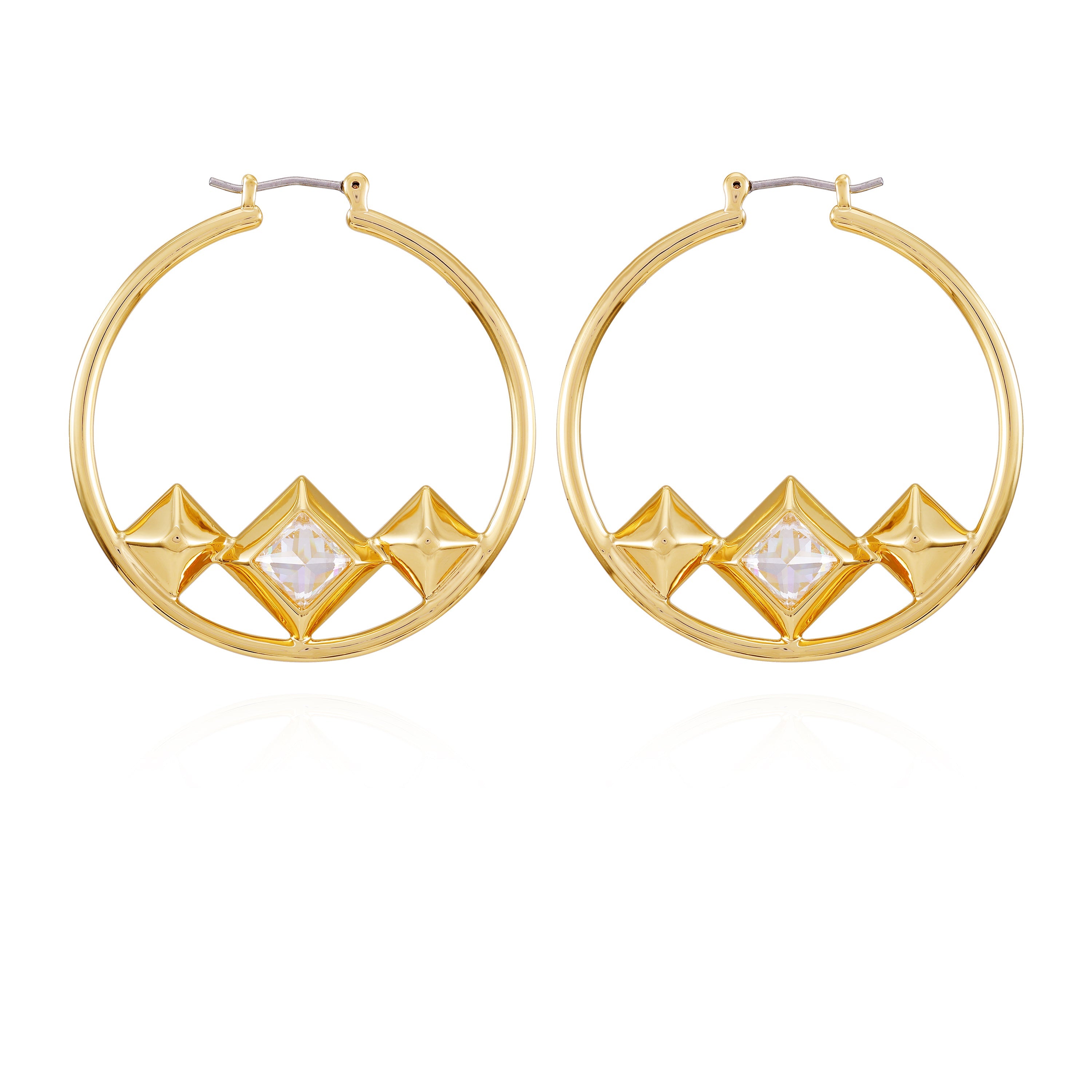 a sleek hoop design with shimmering crystal stones seemingly floating along the goldtone band. This elegant combination adds a touch of sophistication and sparkle. making these earrings a versatile accessory for any occasion.