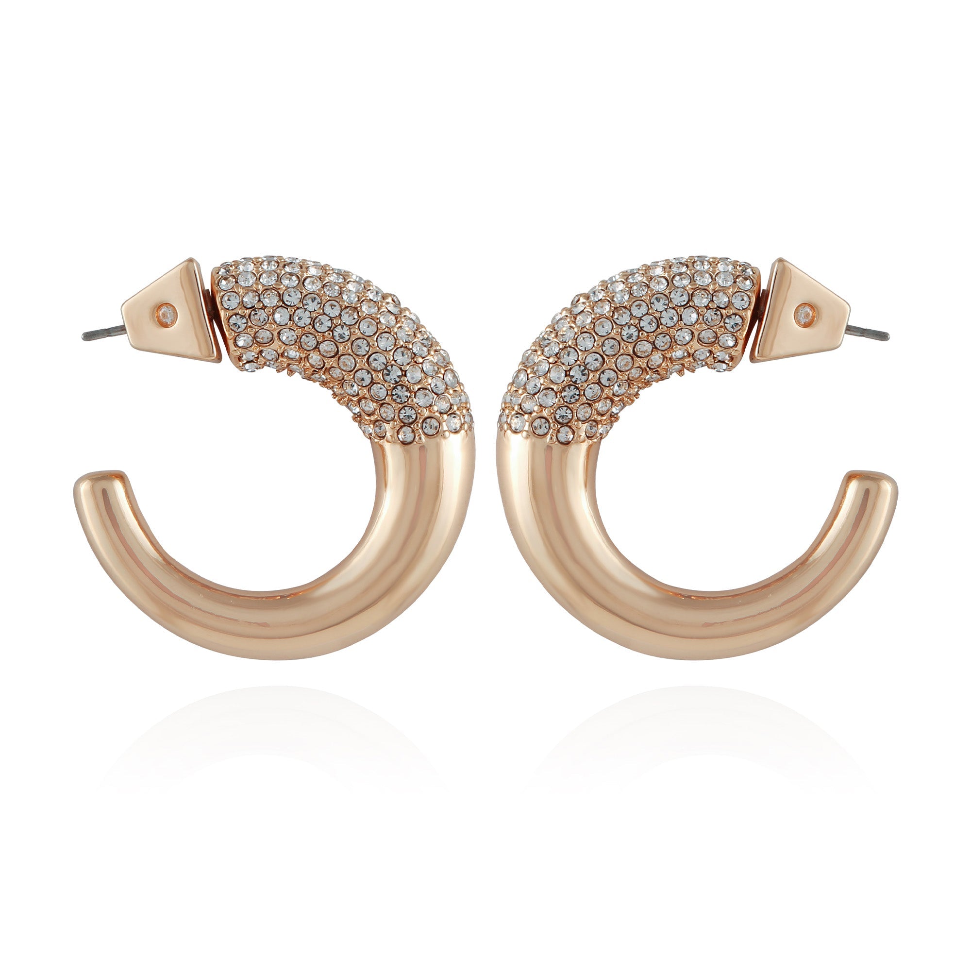 Features a sleek. open hoop design adorned with shimmering pave crystals. Their goldtone finish enhances the luxurious appeal. making them a dazzling accessory that adds sparkle and sophistication to any look.