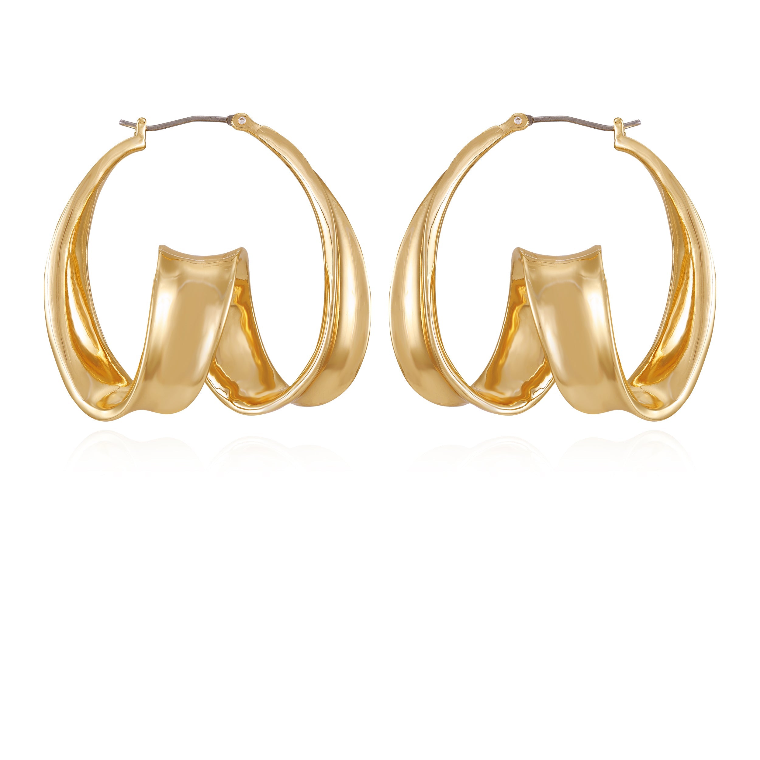 A unique spiral design that adds a modern twist to the classic hoop silhouette. The goldtone finish enhances their sleek and contemporary style. making these earrings a standout accessory for adding a touch of elegance and flair to any outfit.