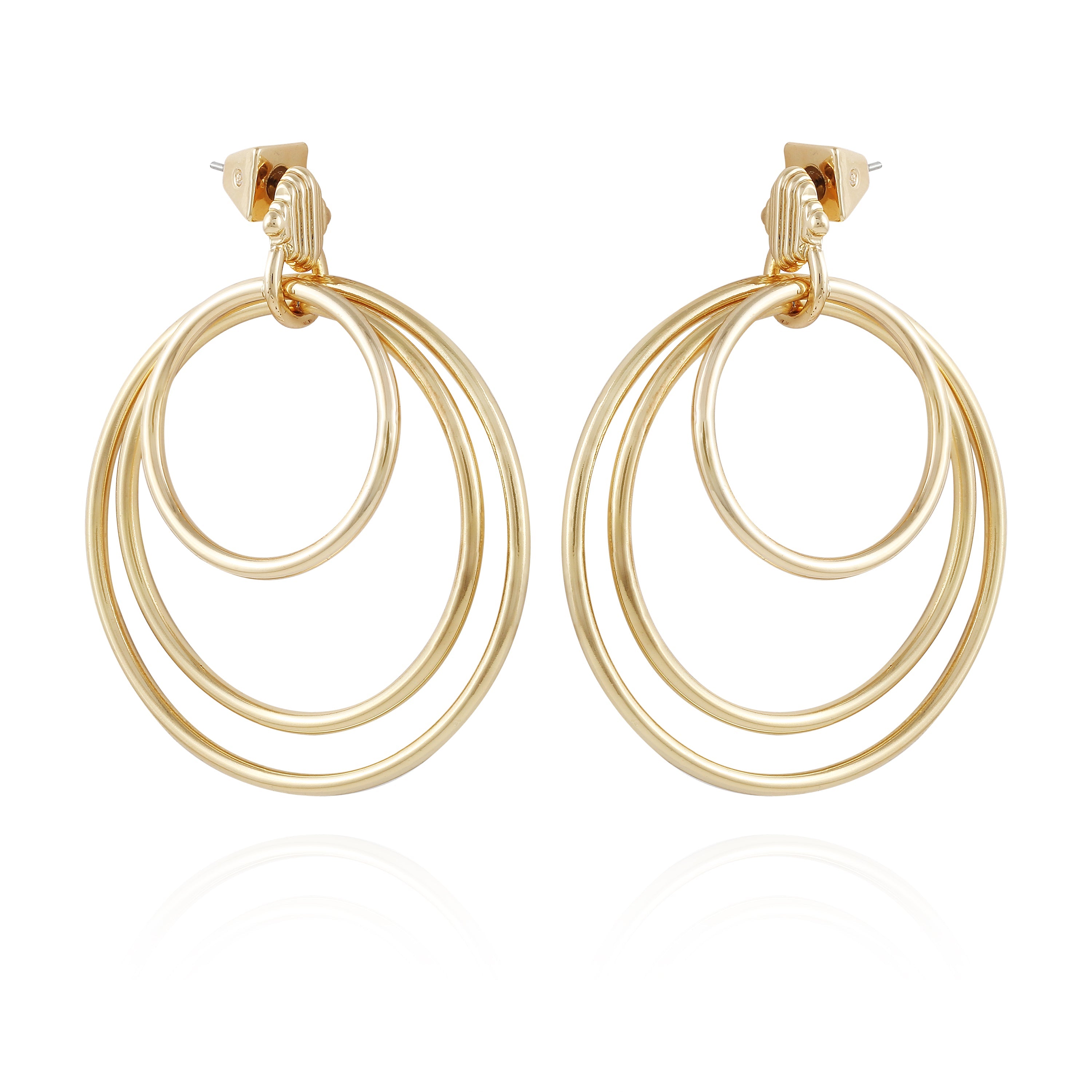 A striking design with three cascading. overlapping hoops. Their goldtone finish exudes elegance. while the layered structure adds depth and movement. making them a bold and stylish statement piece for any occasion.