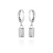 These earrings feature a huggie hoop design that hugs the ear comfortably. with a rectangular glass stone charm that adds a touch of elegance.
