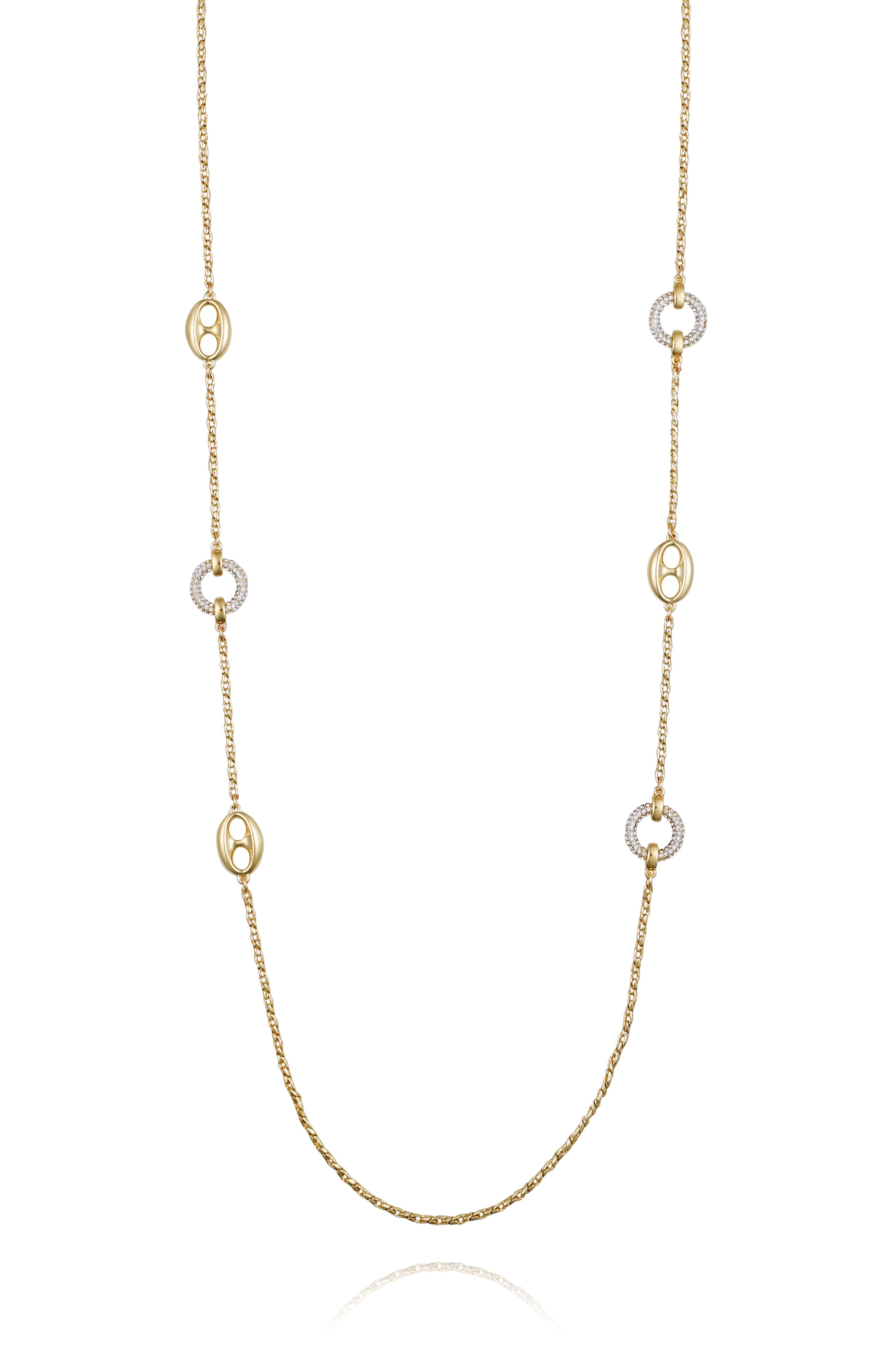 Elevate your layering game or make a subtle statement with this chic Vince Camuto long station necklace. This versatile piece features a polished gold-tone chain interspersed with a captivating mix of elongated oval links and sparkling pavé crystal-accented rings. Its generous length allows for various styling options – wear it long. double it up for a layered look. or even knot it for a modern touch. A sophisticated accessory that effortlessly transitions from day to night