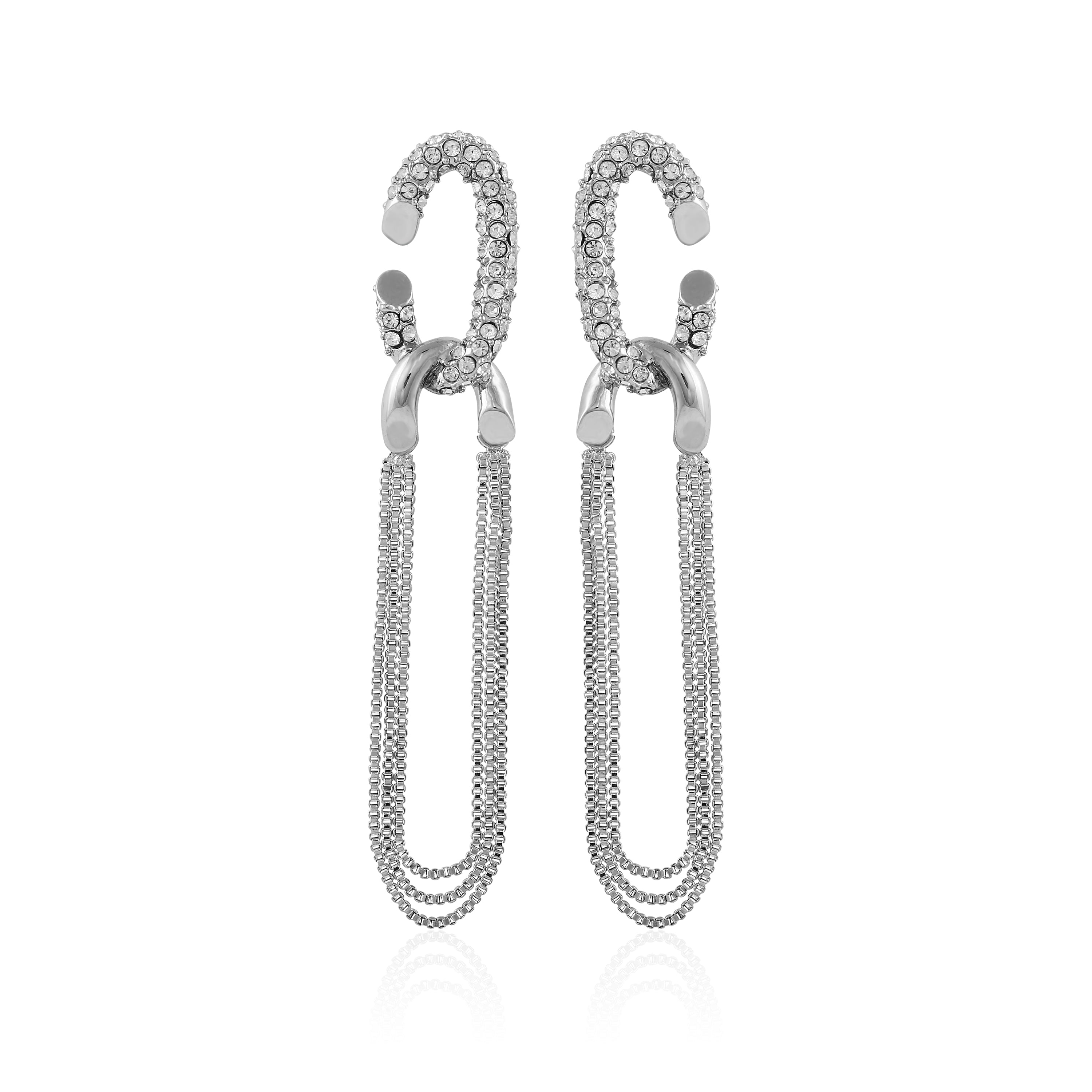 These beautiful drop dangle earrings feature a pave huggie hoop design and a delicate chain tassel. creating a unique and eye-catching accessory. The huggie hoops are embellished with sparkling pave stones. adding a touch of glamour to the earrings.